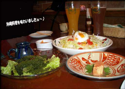 海藻みたいなのが「海ぶどう」隣のは「豆腐庸」(豆腐を泡盛につけて発酵させたものらしい)