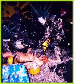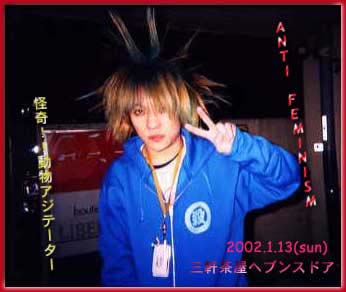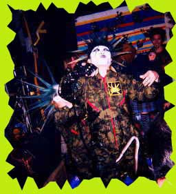 羽まみれになりながらステージにあがるブッチャー うぉ〜草刈り機の登場だ。ダッチワイフ切り裂くぞ〜!!